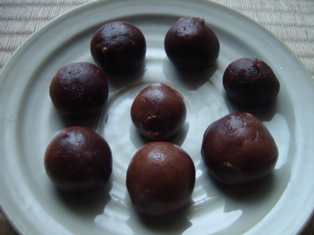 まずチョコクリームを作ります。まだ温かいうちに米粉と合わせてゆき、ベタベタと手に付かない程度の固さまで粉を追加しながらまとめてゆきます。あとは丸めて電子レンジで1分ほど加熱。