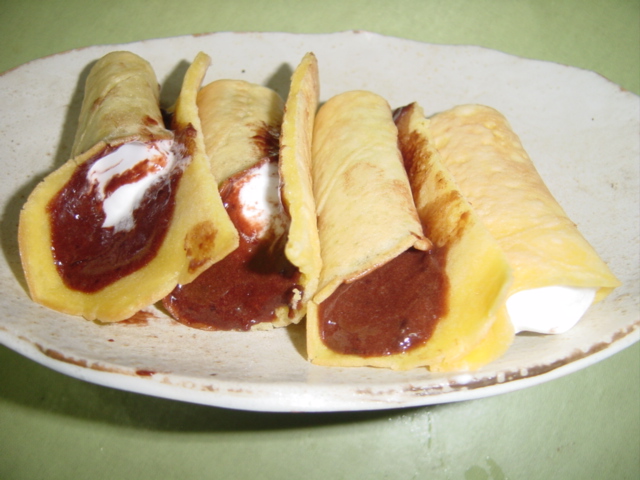 で、チョコクリームをガッツリと味わうには単体ではなくパンケーキと合わせた方が良い、ということになるのでチョコクリームを米粉のパンケーキで包んでみることにしました。