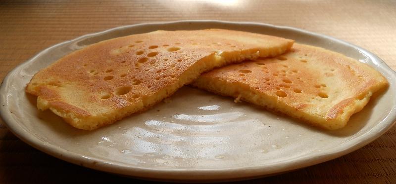 でも小麦牛乳断食修行者なので行列に並んで食べるというわけにもゆかず、上新粉で作るいつものホットケーキを厚焼きにしてみました。