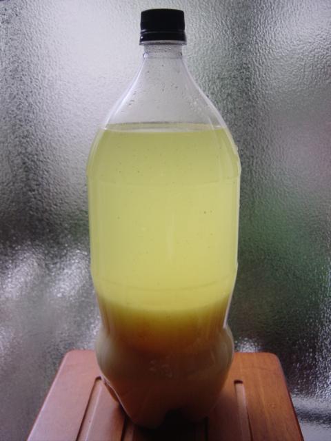 ペットボトルの1/3程度まで飲みコーンフラワーの沈殿具合が足らないようなら継ぎ足します。じゅうぶんコーンフラワーが残っていれば砂糖水とビタミンBだけを継ぎ足して再び発酵させてます。