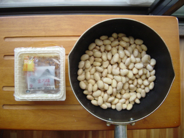 で、用意する材料は大豆の水煮、市販の納豆だけ。スーパーで買ってきた大豆の水煮を市販の納豆に付いている納豆菌で発酵させます。