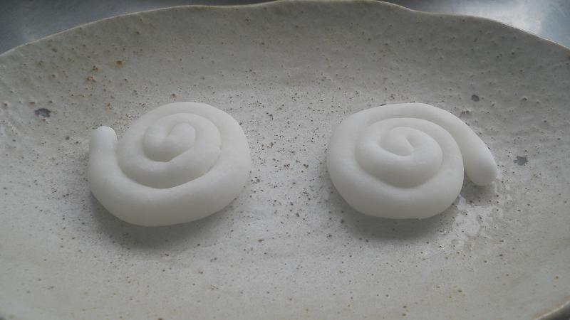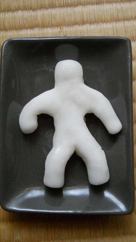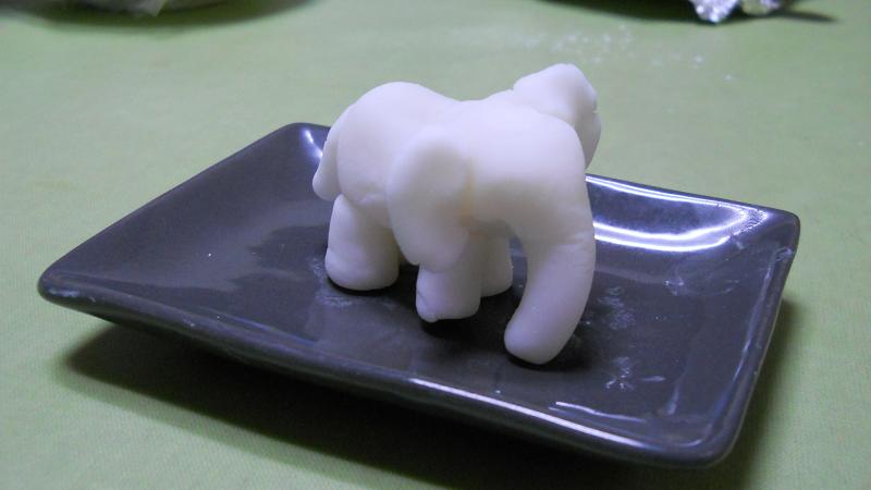 米粉2:砂糖1くらいの割合のところへ、こねても手にこびりつかない程度の固まりになるように熱湯を加え、練ってゆきます。後はお好みの形を作って電子レンジで20~30秒加熱するだけでマジパン的な餅菓子の完成です。