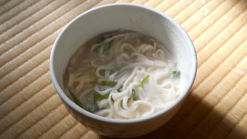 ↑冷めにくいようにどんぶりに盛り付けてますがパスタのつもりです。箸で食べたらうどん。フォークに巻きつけて食べればパスタなのです。
