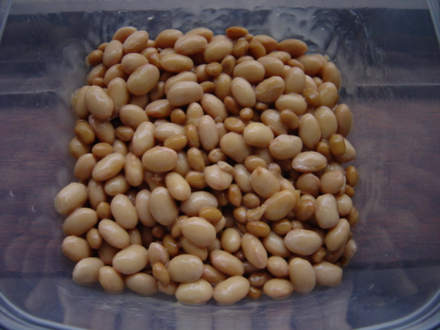 で、用意する材料は大豆の水煮、市販の納豆だけ。スーパーで買ってきた大豆の水煮を市販の納豆に付いている納豆菌で発酵させます。