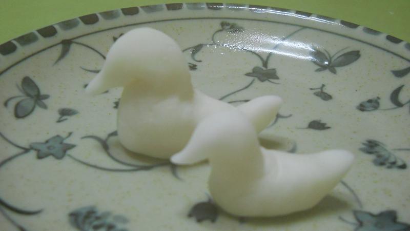 米粉2:砂糖1くらいの割合のところへ、こねても手にこびりつかない程度の固まりになるように熱湯を加え、練ってゆきます。後はお好みの形を作って電子レンジで20~30秒加熱するだけでマジパン的な餅菓子の完成です。