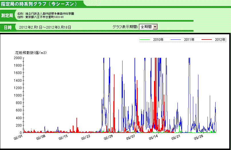 今年の花粉の量は昨年よりは少ないようですが確かに飛散してはいるようです。周りの花粉症の人を見れば飛んでいることに疑いの余地はありません。下のグラフは2月以降の花粉の飛散状況を表したものです。
