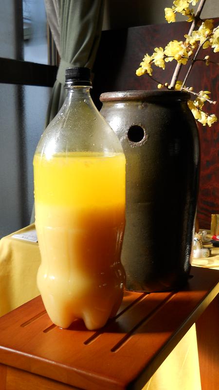 そしてなんとなく「フルーティーでいいかな」と思いバナナの裏ごしをいれてみました。一晩経つと容器はパンパンで盛んに気泡がシュワシュワしており酒臭いのです。口に含むとアルコール発酵をしていることが感じられ、乳酸菌よりも酵母菌が優位になったようです。