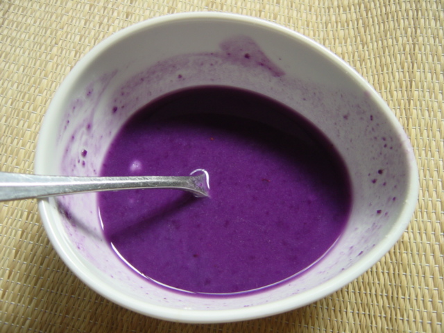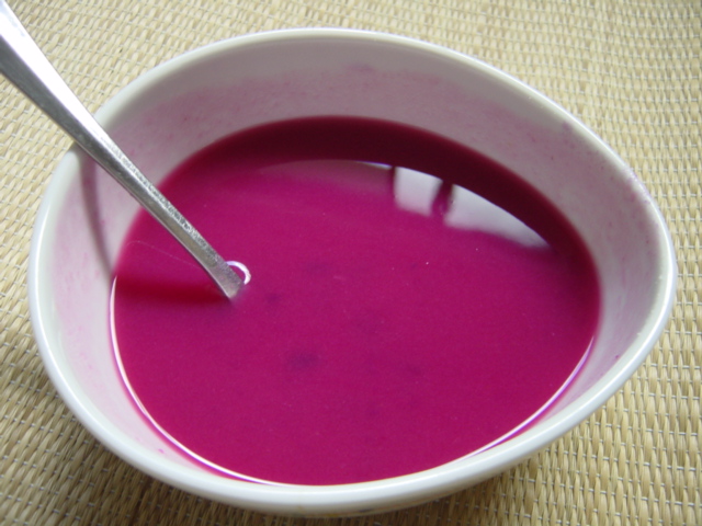 おお!きれいな赤紫に変色しました。Blue Cakeでも紫芋に重曹やお酢を加えて色の化学変化を楽しみましたが、やはりアントシアニンが含まれる食材は面白い。